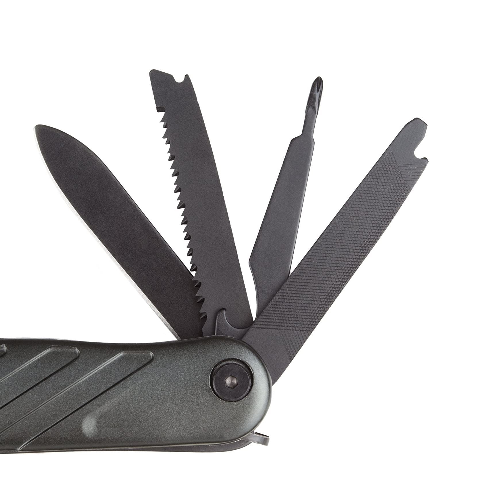 • a flat and round plier grip, knife blade, wood saw, bottle opener and numerous more, you will have every tool you need at your fingertips.